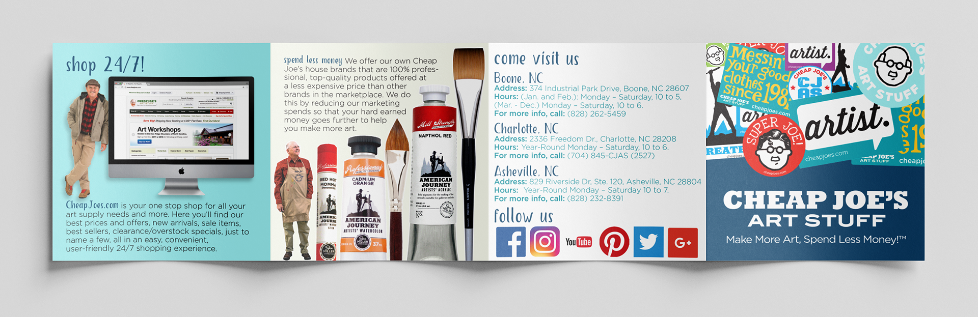 This brochure is a handout for art shows, events, stores, and vendors. It features a rolling 4-fold square design, with each panel highlighting a different aspect of the business. Each panel measures 4" x 4".